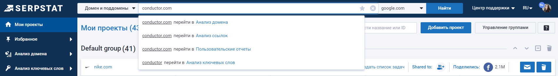 В этом разделе находится список всех ваших проектов. В списке проектов вы можете: редактировать существующие проекты, создавать новые, объединять их в группы и просматривать общую информацию о проекте.