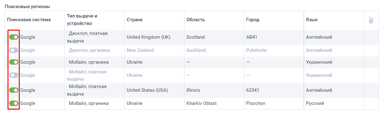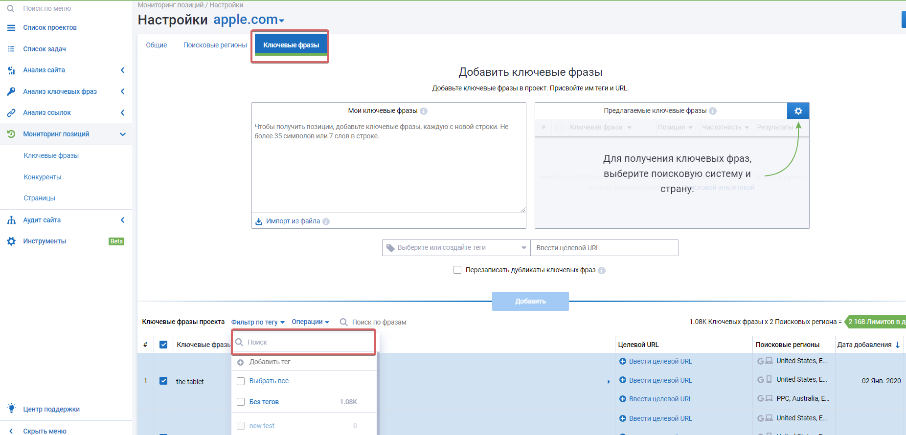 4. Мониторинга позиций домена по выбранным ключевым фразам.