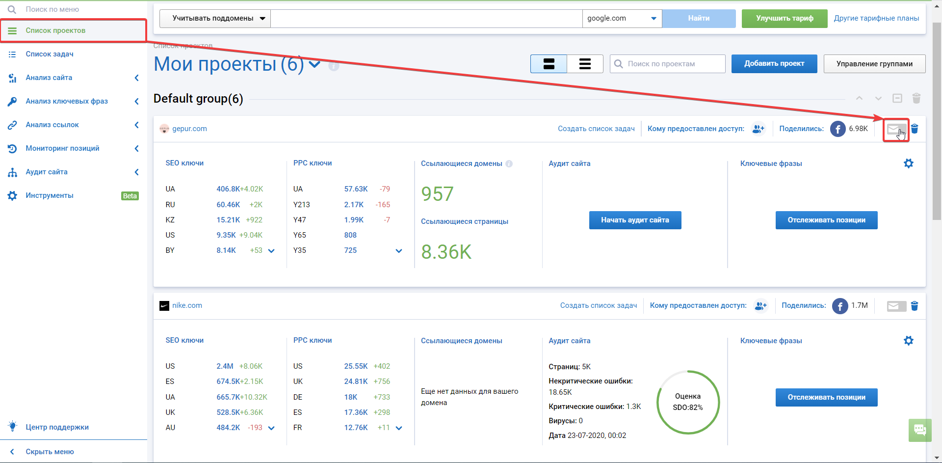 Да. В Serpstat можно настроить автоматическую рассылку некоторых отчетов. Для этого перейдите в Список проектов и нажмите соответствующий значок в правом верхнем углу проекта.