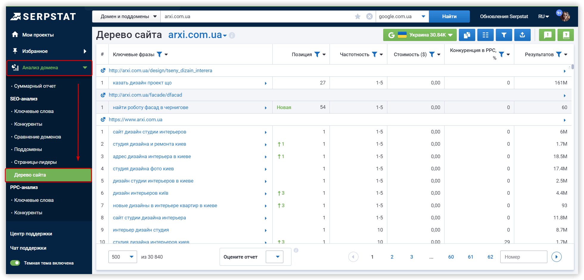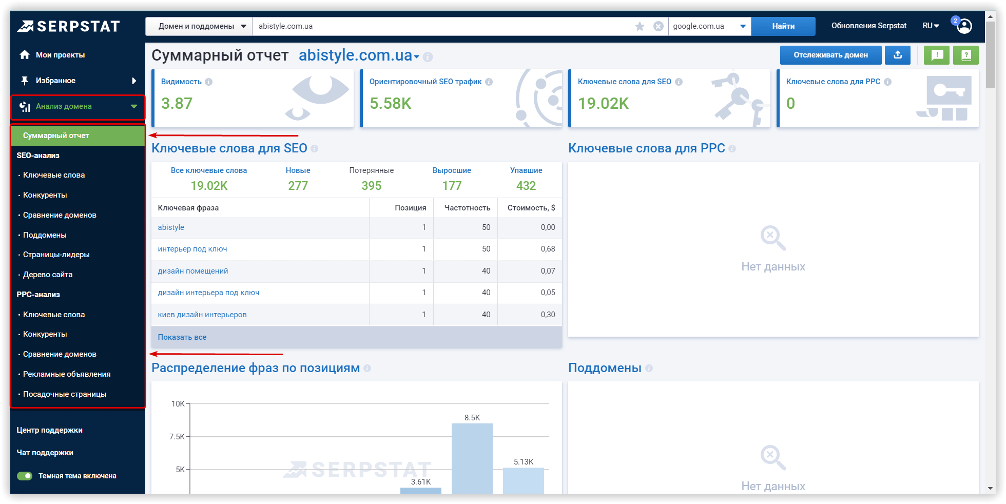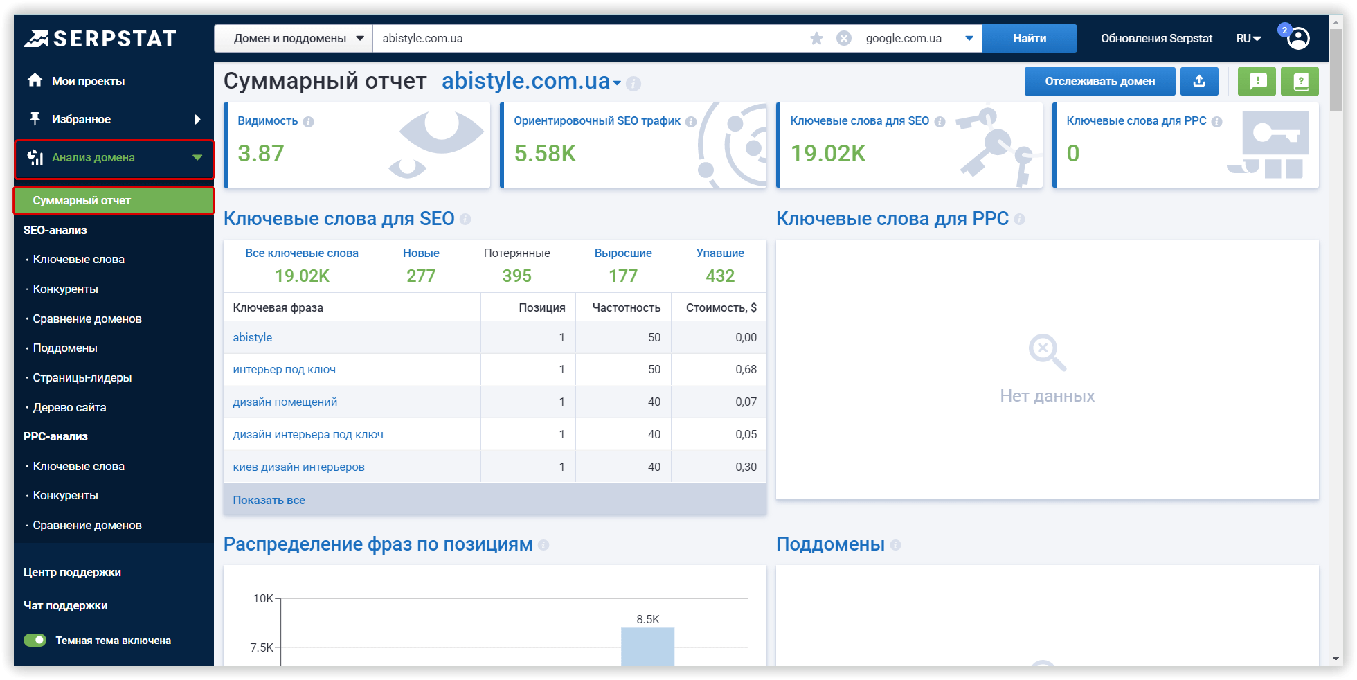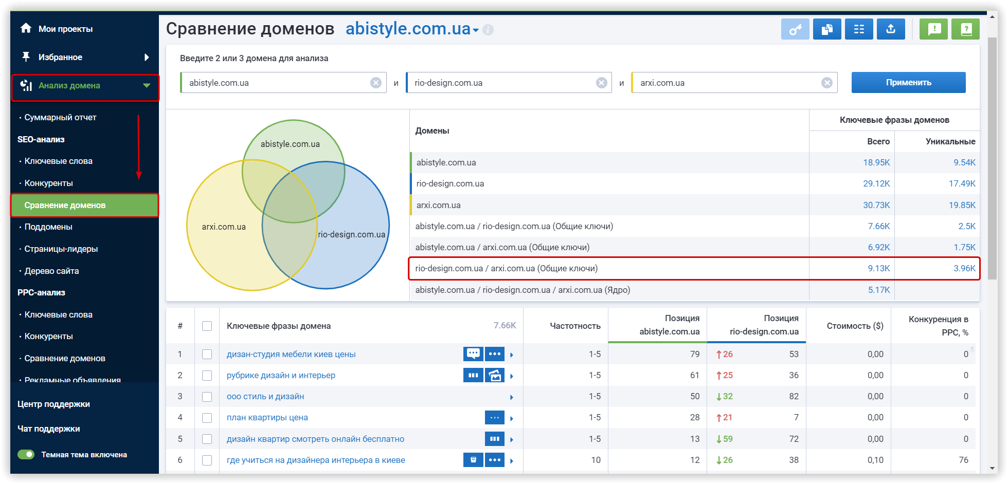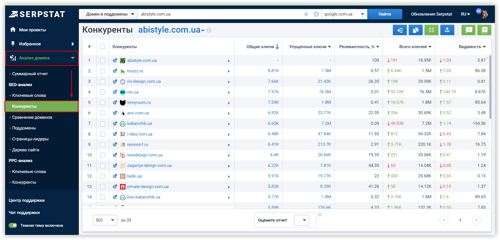 Другой вариант поиска конкурентов — использовать Serpstat. Тут преимущество в том что выполучите объективную информацию по какому количеству ключей ранжируется конкурент, сколько из них такие же как и у вас, чего из запросов у вас нет (упущенные ключи - значит упущенные возможности для бизнеса). Это важная информация, которую анализируя руками топ выдачи вы никогда не получите, тем более за пару секунд. Введите домен в поисковую строку сервиса, выберете поисковую базу и нажмите «Поиск». Далее, перейти в отчет Анализ домена → SEO-анализ → Конкуренты. Получите результат.