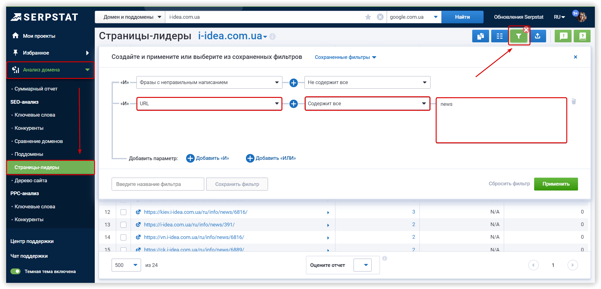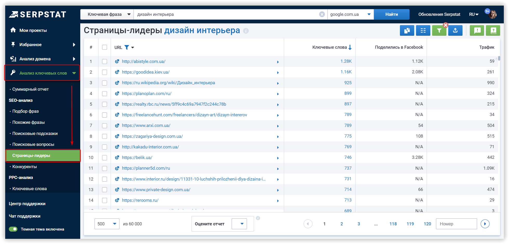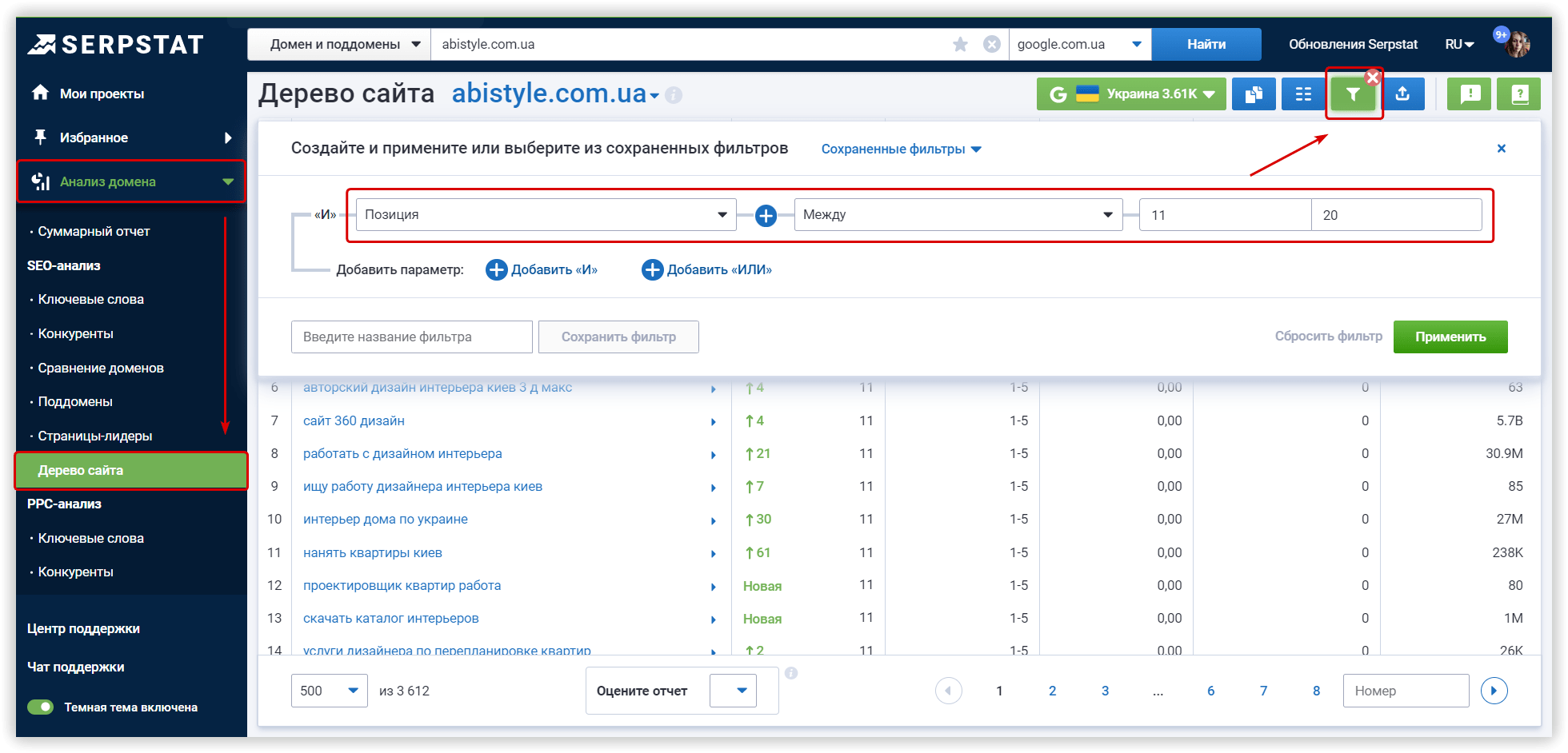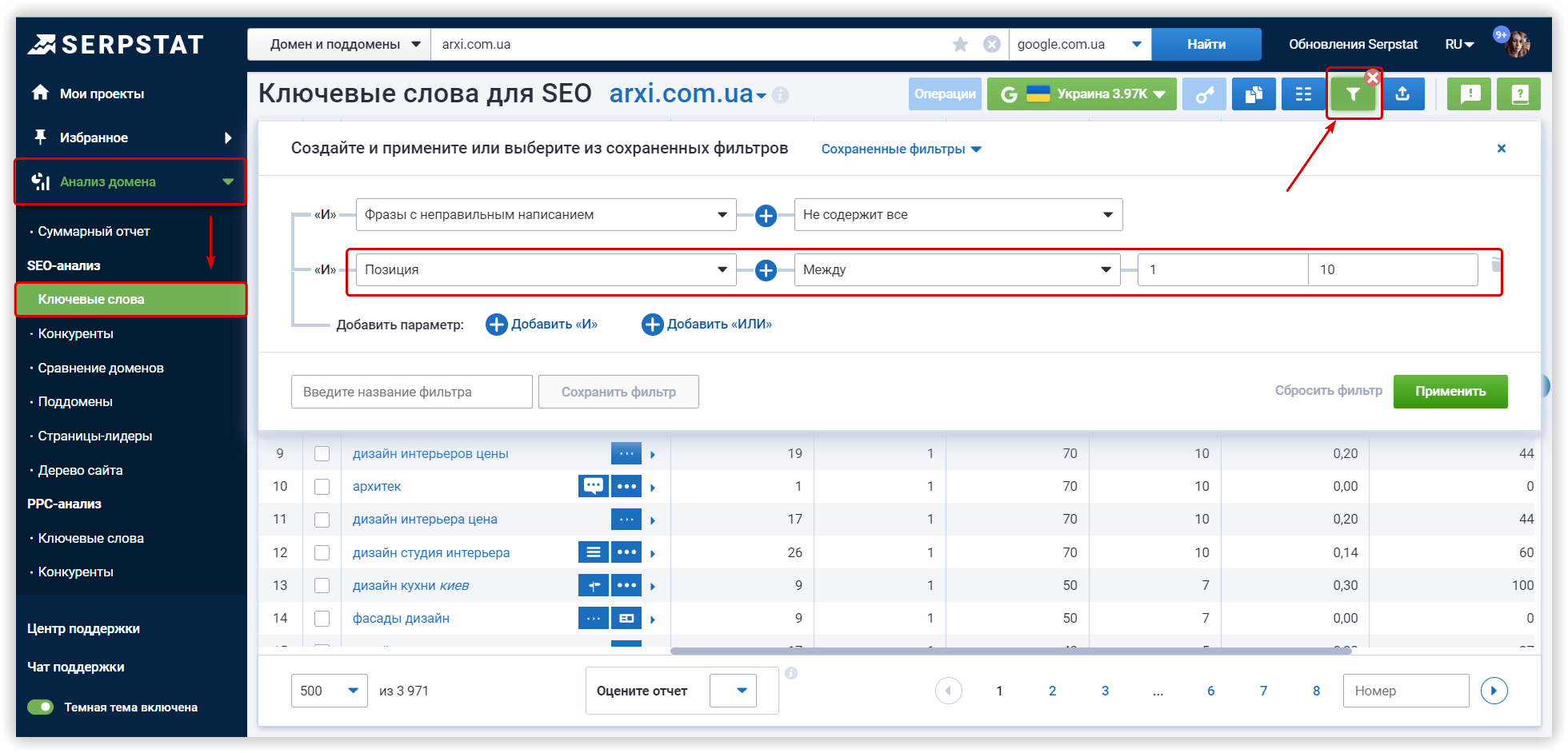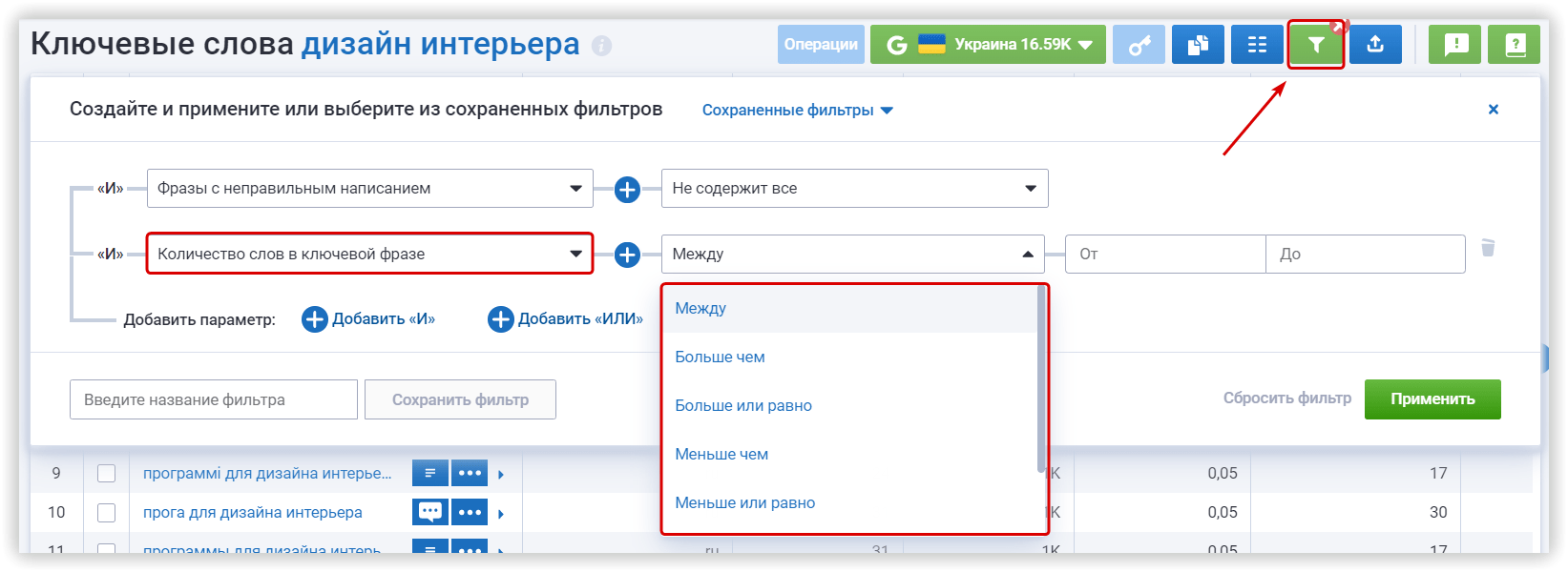 LSI-слова легко получить, используя специальные сервисы, например, Serpstat или подсказки в выдаче Google. Чтобы найти фразы с длинным хвостом с помощью Serpstat, достаточно вести искомую фразу в поисковую строку и в отчетах модуля Анализа ключевых фраз выставить фильтр по количеству слов во фразе: