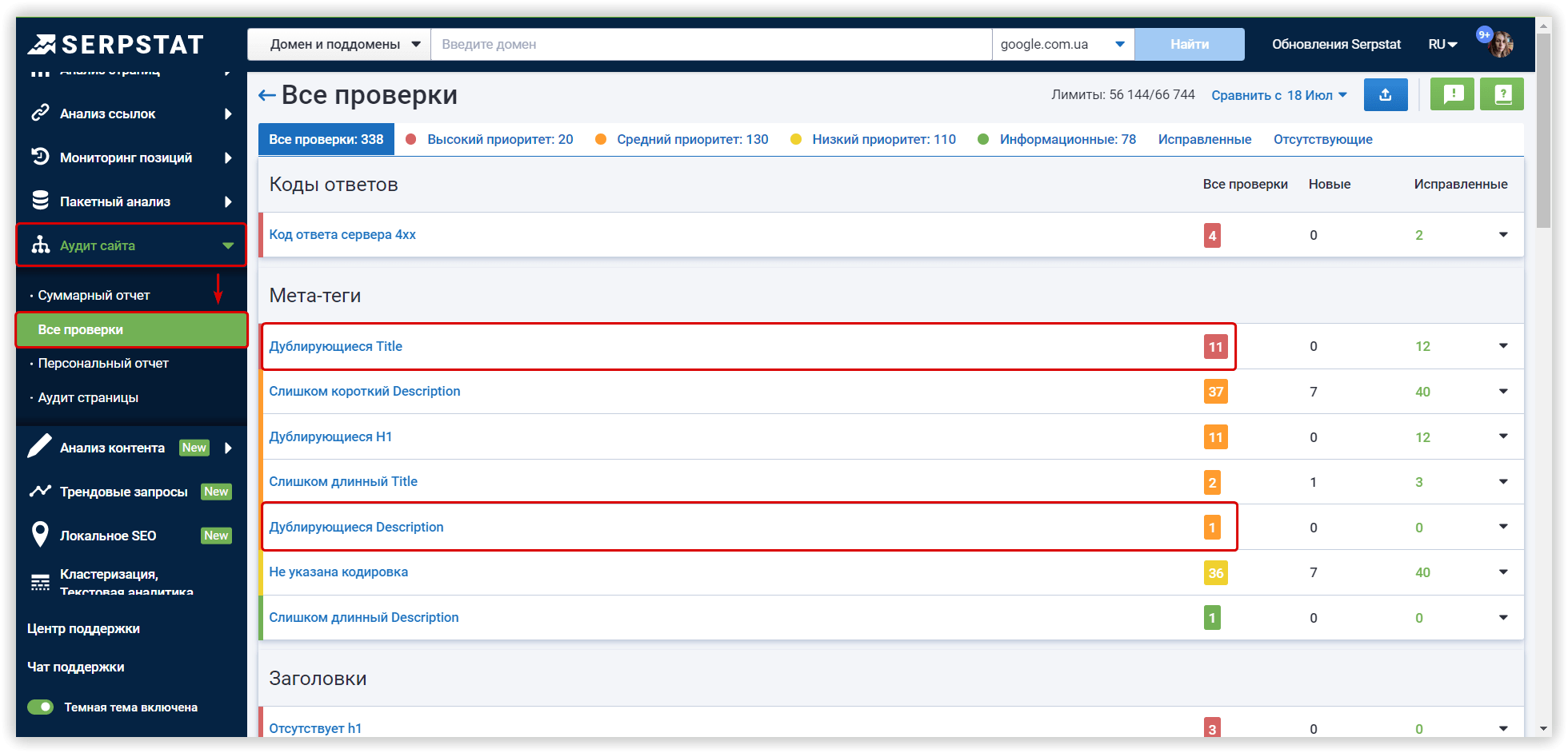 Еще один способ поиска дублей — провести проверку сайта с помощью модуля Serpstat Аудит сайта. Инструмент просканирует сайт на технические ошибки и даст полный отчет, в котором вы увидите сводку: