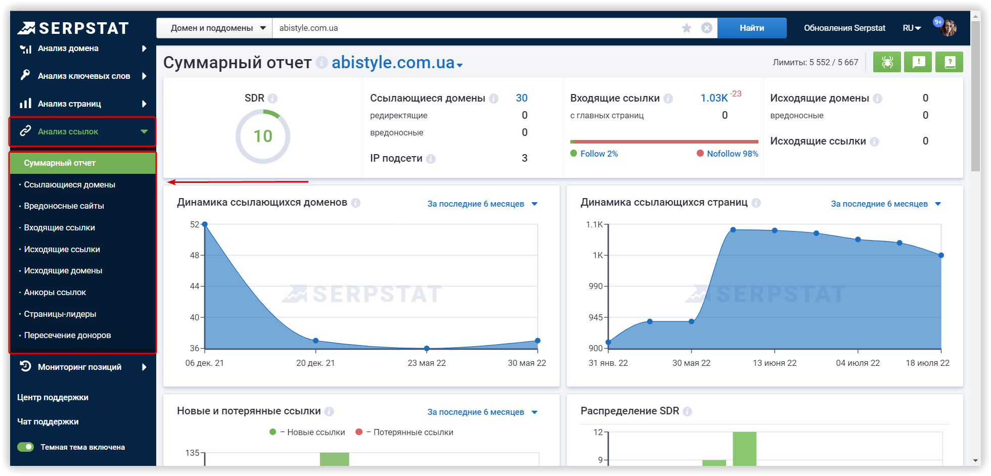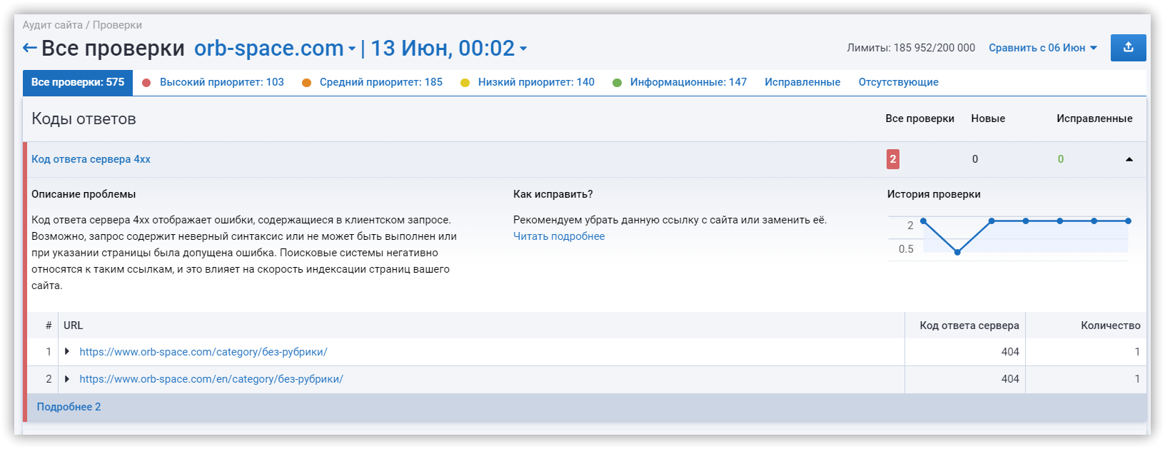 Чтобы найти битые ссылки через Serpstat, достаточно провести Аудит сайта, из сводки по ошибкам перейти в раздел Коды ответов. В нем видим все URL, которые отдают 400-е ошибки: