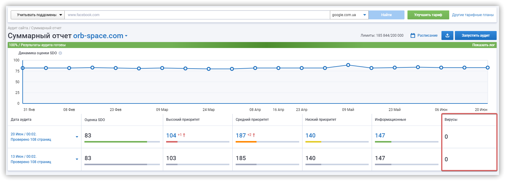 Также угрозы можно обнаружить с помощью аудита Serpstat. После того как ресурс будет просканирован, на главном дашборде вы увидите, есть ли на сайте вирусы. Как видим, на анализируемом сайте угрозы не были обнаружены.