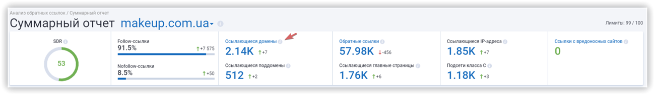 - «% от всех» — процентное отношение текущего типа ссылок ко всем обратным ссылкам на анализируемый сайт.
