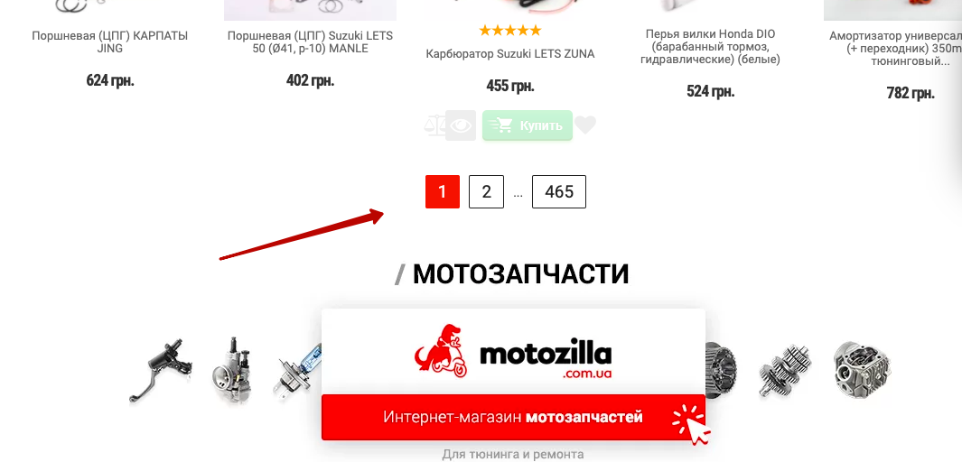 Страницу пагинации легко найти по ключевым словам «запчасти на скутер» или подобным хвостам, (скрин внизу).