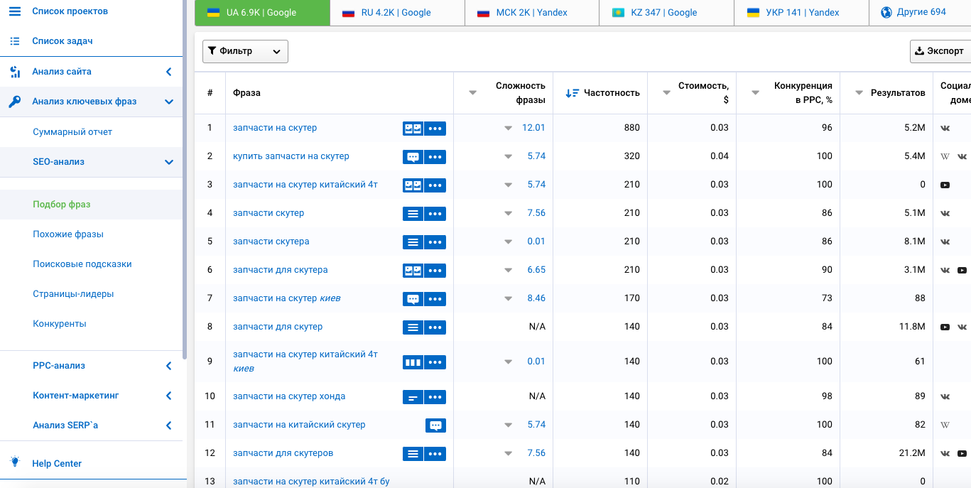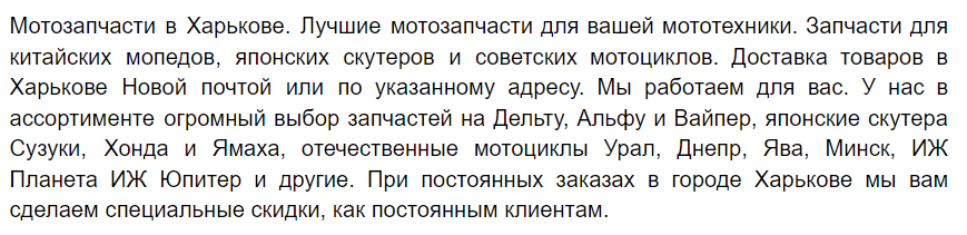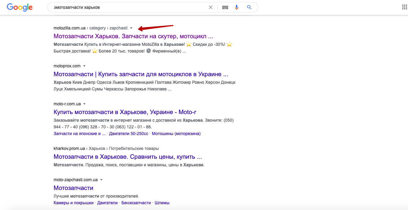Однако затем, расширяя семантику сайта через Serpstat и копаясь в ключевых словах, я увидел запросы связанные с мотозапчастями в разных городах. Потом промониторил самые большие города Украины на частоту Мотозапчасти + «город».
