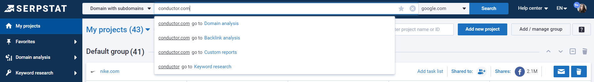 While analyzing the site in the "Domain analysis" — "Overview" section, (1) click the "Track domain" button or (2) the star in the search bar. The domain will automatically appear in the "My projects" section.
