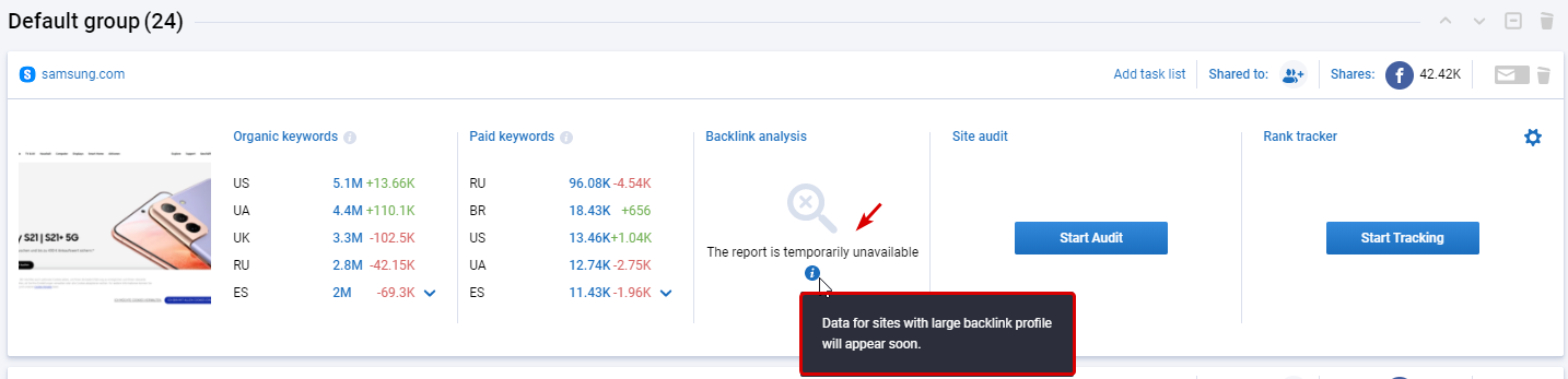 * In the Backlink analysis block you may see a message that "The report is temporarily unavailable." This is due to the fact that the analyzed domain has a large backlink profile, so information for such sites is temporarily unavailable in our service, but it will appear soon.