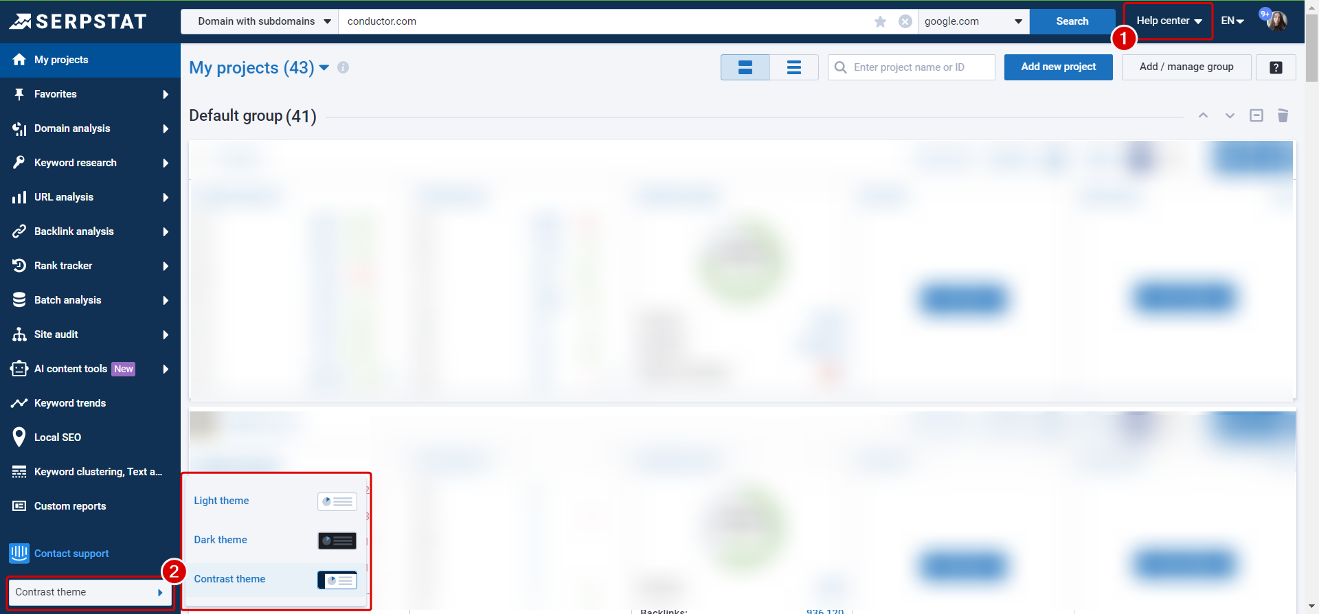 1. Through the Help Center in the upper right corner, navigate to our Blog, Serpstat updates, Knowledge base, Serpstat Academy, Privacy Policy.