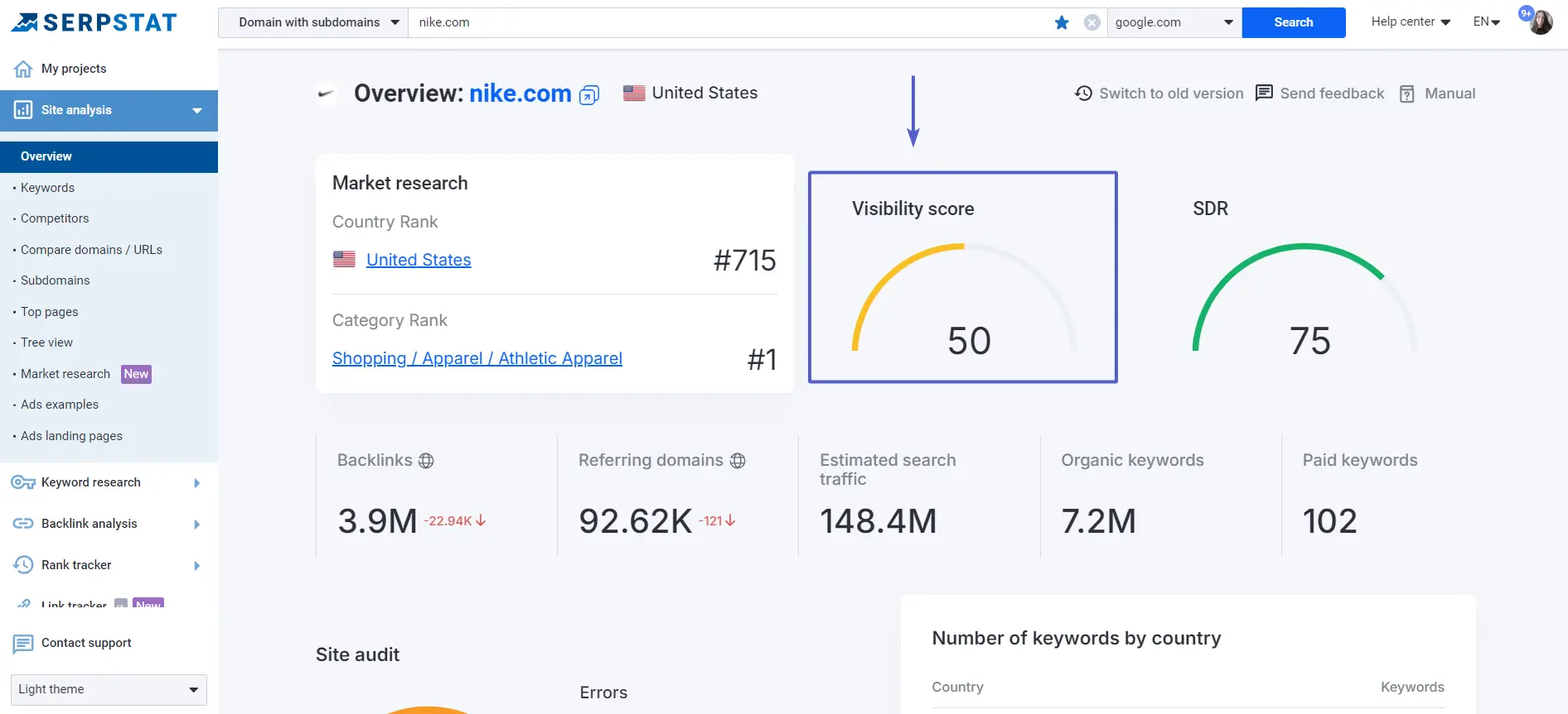 There you are. You will see the your domain's Visibility score in the top left corner: