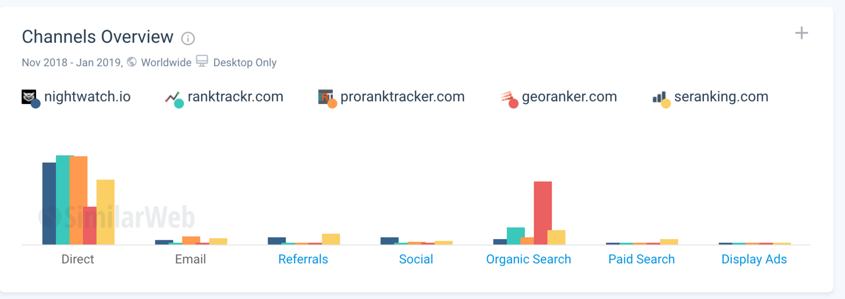 To get these insights, you can use SimilarWeb — it reveals all the necessary information quite easily. On a screenshot below you can see that for all the sites that I've analyzed the main traffic channel is direct. This gave me an idea that having a strong brand is of high priority in this niche. Thus, reinforcing the brand will lead to higher rankings. For instance, this can be done through investing in building relationships with the industry influencers.