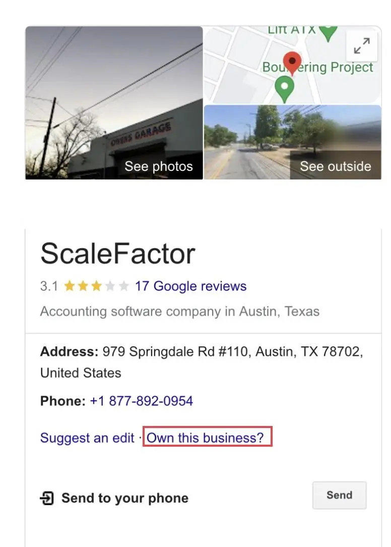 If you use Google search, the next step will be to click on “Own this business”. But if you use Google Maps, click on “claim this business” as seen in the image below: