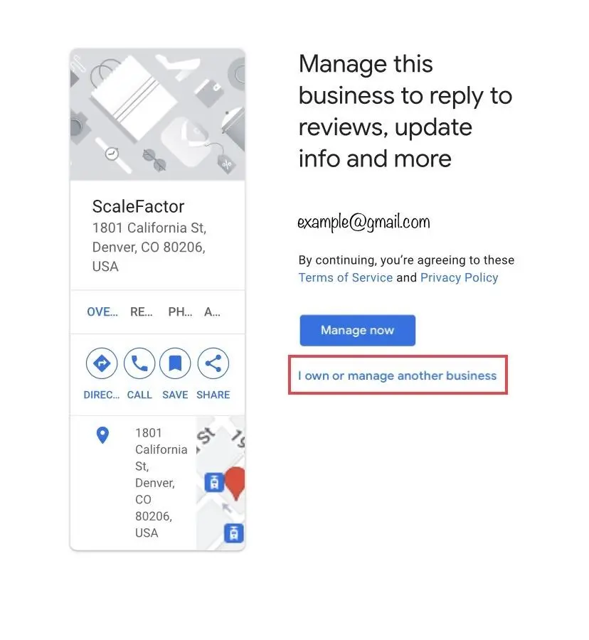 Next, click the “manage now” button. If you notice that the business profile isn’t yours, you can click on “I own or manage another business” and follow the prompts.