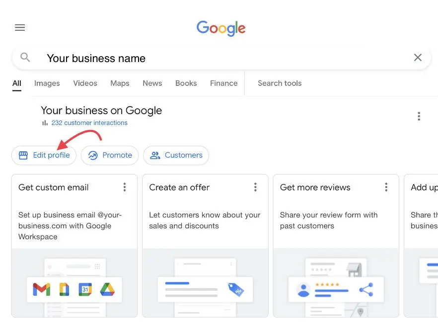 If you notice an error after you set up your profile, simply use Google search to fix this. First, type your business name into the search bar. Since you already have access to your business profile, you’ll see a result like this one: