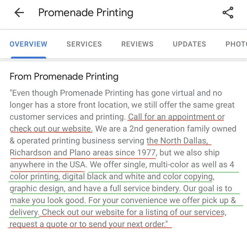 Promenade Printing proceeds to mention the type of prints they provide and close with a clear call to action—telling prospects to check their website for a listing, request a quote, or send an order. So, like Promenade, you can apply this technique when crafting your business description.