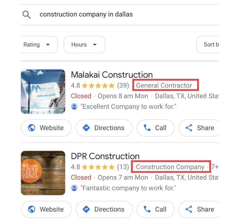 As a business owner, you can optimize your Google business profile by adding relevant categories. Doing this ensures that your business is more likely to show up in search results when prospects search for businesses within your industry. Here’s an example below: