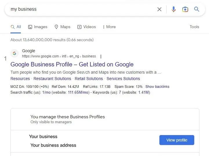 Go to Google search and type in “my business”. Your business profile will show up in the search result as seen in the image below: