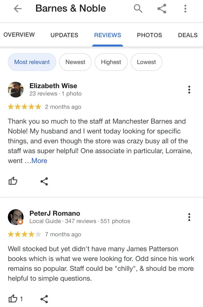 These reviews also serve as testimonials for potential customers. Here is an example of these reviews from Barnes & Noble’s business page: