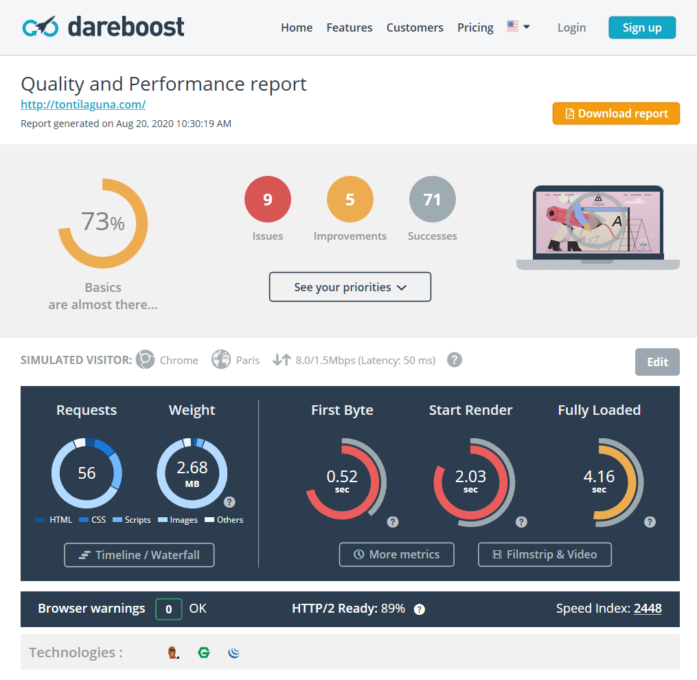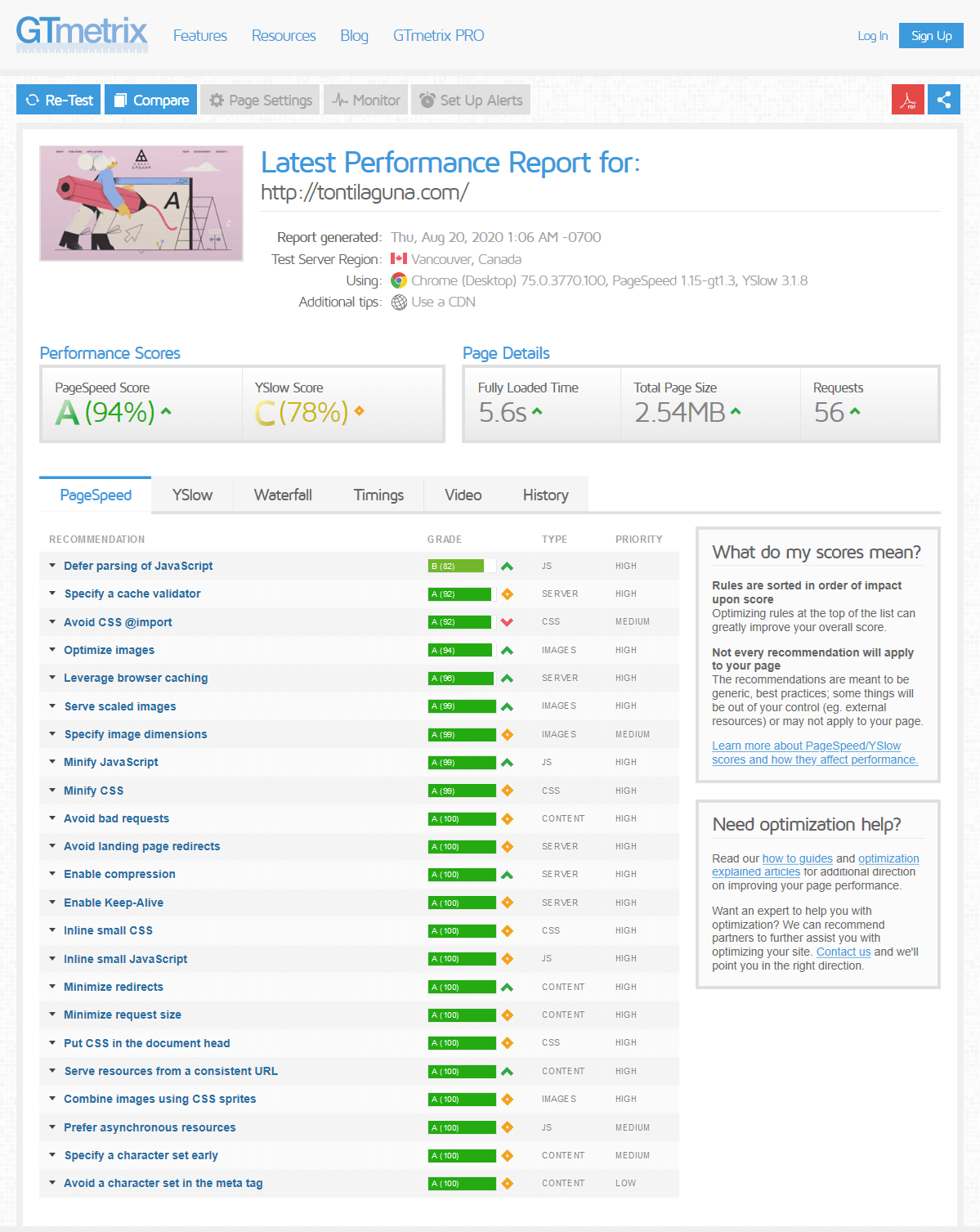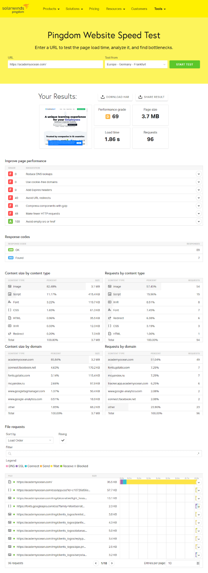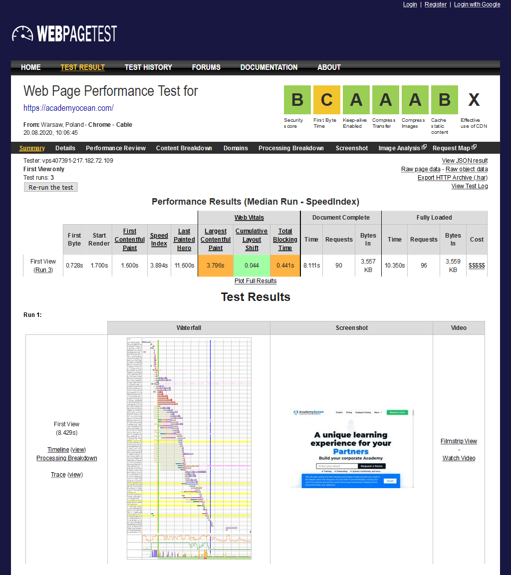The test itself takes a while — mainly because WebPageTest checks the page three times by default and then averages the results. But the amount of information available in the report rewards you for waiting. This tool will show us how long it took individual elements of the page to load in the form of a cascade diagram, scores (A..F) in five different areas, a "checklist" of optimization along with recommendations, breakdown of content by file types, the list of hosts, breakdown of the connection by stages, screenshots and many more.